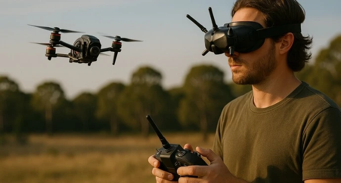 A person is flying a drone using a controller while wearing FPV goggles. The goggles show the drone’s live camera view, allowing the pilot to control the drone more accurately.
